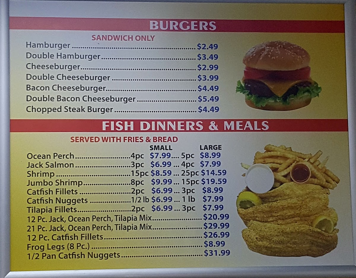 Jumbo Shrimp (4pc) Shrimp (10pc) Tilapia (3pc) Perch (2pc) Jack Salmon (2pc) Catfish (2pc) Wings (3pc)